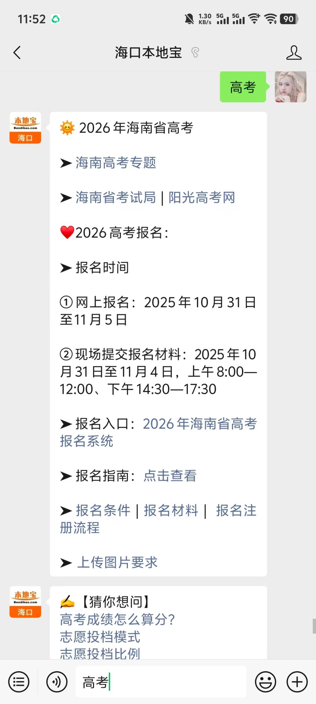 温馨提示:微信搜索公众号【海口本地宝】,关注后在对话框回复【高考】可获2026年海南高考志愿填报时间/入口/指南,查看往年高考位次查询入口、高考分数线,海南热门高校招生章程/收费标准/人数/历年分数线以及实用工具等。